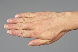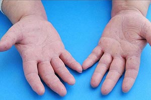 指间湿疹发生于指间隙和指背,表现为红斑、皲裂和脱屑。戒指湿疹从戒指下方皮肤开始发疹,常与局部去污剂冲洗不干净有关,机械刺激也可能起到作用。手部皮炎的一个罕见类型为蛋白质接触性皮炎,起病时表现为接触性荨麻疹,随后表现为湿疹。