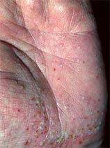 水疱型湿疹或汗疱疹表现为掌指深在性水疱,瘙痒明显(见图 2)。水疱自发性脱屑、消退后,又有新水疱发出,应与掌跖脓疱病相鉴别。该型治疗较困难。